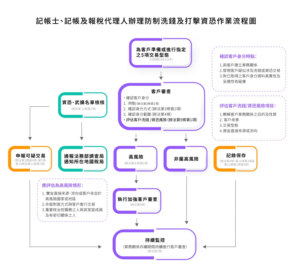 記帳及報稅代理人防制洗錢專區 身為國家金融秩序的重要守門員,記帳及報稅代理人在防制洗錢與打擊資恐(AML/CFT)的體系中扮演關鍵角色。本專區旨在協助會員快速掌握《洗錢防制法》之最新規範,落實「確認客戶身分」、「紀錄保存」及「申報可疑交易」三大核心義務。透過本專區提供的實務指引、風險評估工具與法規彙編,我們期能協助會員建立完善的內部控制制度,在保障執業安全的同時,共同維護我國金融交易的透明與國際信譽。 【一、相關法令】 洗錢防制法 (113.07.31) 資恐防制法 (107.11.07) 記帳士暨記帳及報稅代理人防制洗錢與打擊資恐辦法 (114.03.12) 【二、公會講義下載】 防制洗錢與打擊資恐講義 (114年6月版) →pdf 【三、相關表格下載】 (此為建議參考表格,請視需求自行下載運用) (一) 事務所應備書表之參考範本 1-1 防制洗錢與打擊資恐風險評估報告→word 1-2 洗錢防制內部控制及稽核政策(內含教育訓練計劃) →word 1-3 內部稽核或自我審查表(財政部提供之「自行檢核表」) 1-4 客戶審查作業封面及客戶審查表(含工作底稿附件歸檔清單) →word (二) 應備書表附件之參考範本 2-1 客戶工商委任書→word 2-2 遵循防制洗錢與打擊資恐聲明暨同意書(個人適用) →word 2-3 法人實質受益人聲明書(法人適用) →word 2-4 法人聲明書附表:「實質受益人」及「高階管理人員」名單(法人適用) →word 2-5 個人資料蒐集、處理及利用之應告知事項暨同意書(工商適用) →word 2-6 洗錢防制教育訓練紀錄暨簽到表→word 【三、相關表格下載】 (參考表) 3-1 536指定534準備即進行交易參考表 3-2 高風險主要的五項行業及其業別明細(請視客戶業務之型態自行增訂) 3-3重要政治性職務之人與其家庭成員及密切關係之人範圍認定標準 (113.12.03) 3-4 疑似洗錢交易申報表 3-5 疑似洗錢交易申報表-記帳士、記帳及報稅代理人填寫說明 【四、集保專區】 集保洗錢防制查詢系統→首次申請程序 錢防制查詢系統 ←點我連結 公司負責人及主要股東資訊查詢平臺 ←點我連結 【五、相關連結】 記帳士暨記帳及報稅代理人執行防制洗錢及打擊資恐業務指引手冊 資恐防制法公告制裁名單 (連結至法務部調查局洗錢防制處) 全聯會 記帳及報稅代理人防制洗錢專區